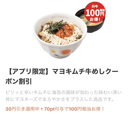 さらに現在このキャンペーンも行われており、すべての牛丼が実質100円引き(30円引き+70松屋ポイント)となります。期間は2025年9月9日11時から9月22日23時59分までとなっていますのでご注意下さい。