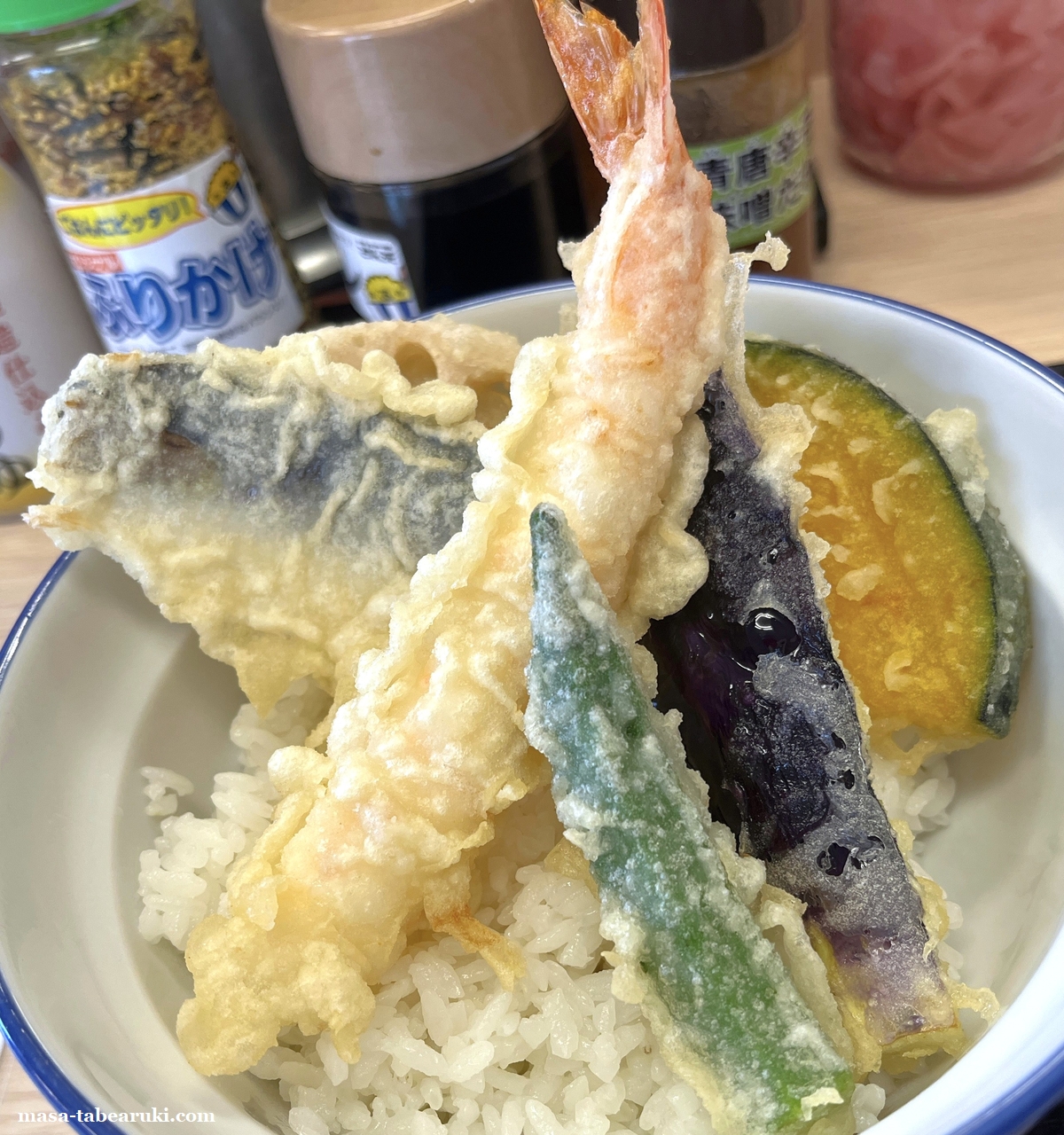 天ぷらは海老、アジ、レンコン、カボチャ、ナス、オクラとなっており、以前の海老天丼において海老2尾が1尾となり、1尾分がアジに変更された形となっています。海老はサイズアップしたとのことですが、どのくらいアップしているのかは記憶だけでは分かりません。どの天ぷらも揚げたての熱々状態で食感は軽くサクッという感じ。卓上のタレをタップリかけて頂きました。