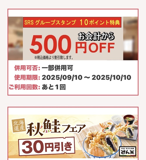 また、今回の来店でSRSグループスタンプも10個貯まったため500円引き券もゲット。もう何回目か覚えていませんが、この券を一番使いやすい宮本むなしで使用することになるやろな。。