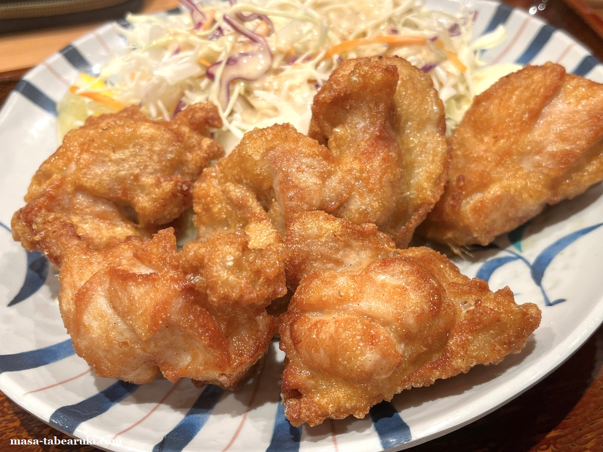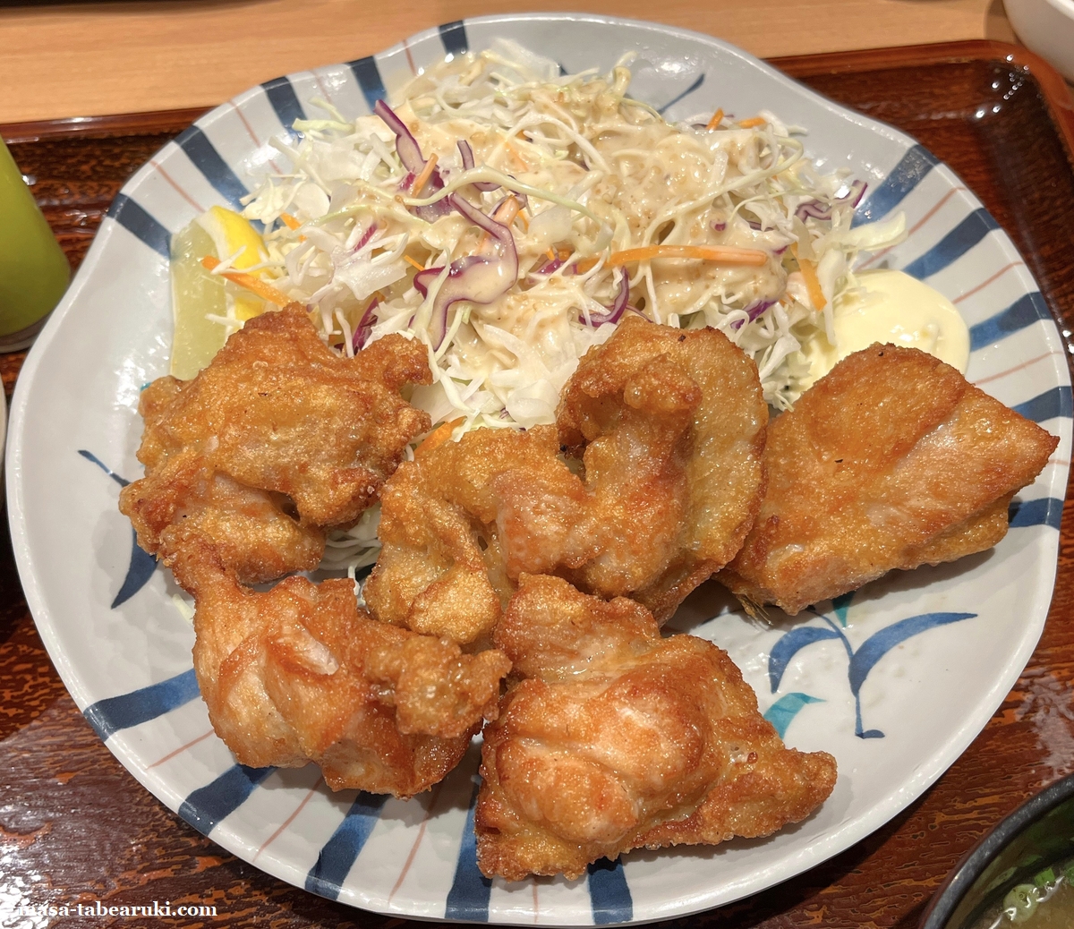 から揚げ定食の唐揚げは5個が基本。唐揚げが7個になる「特から揚げ定食」もあり価格は1,080円となっています。唐揚げは中くらいのサイズでそれほど大きなものではないものの、揚げたての熱々でコロモはカリカリのタイプ。下味もしっかりと付けられているため、そのまま食べても旨いですね。ご飯との相性は言うまでもありません。