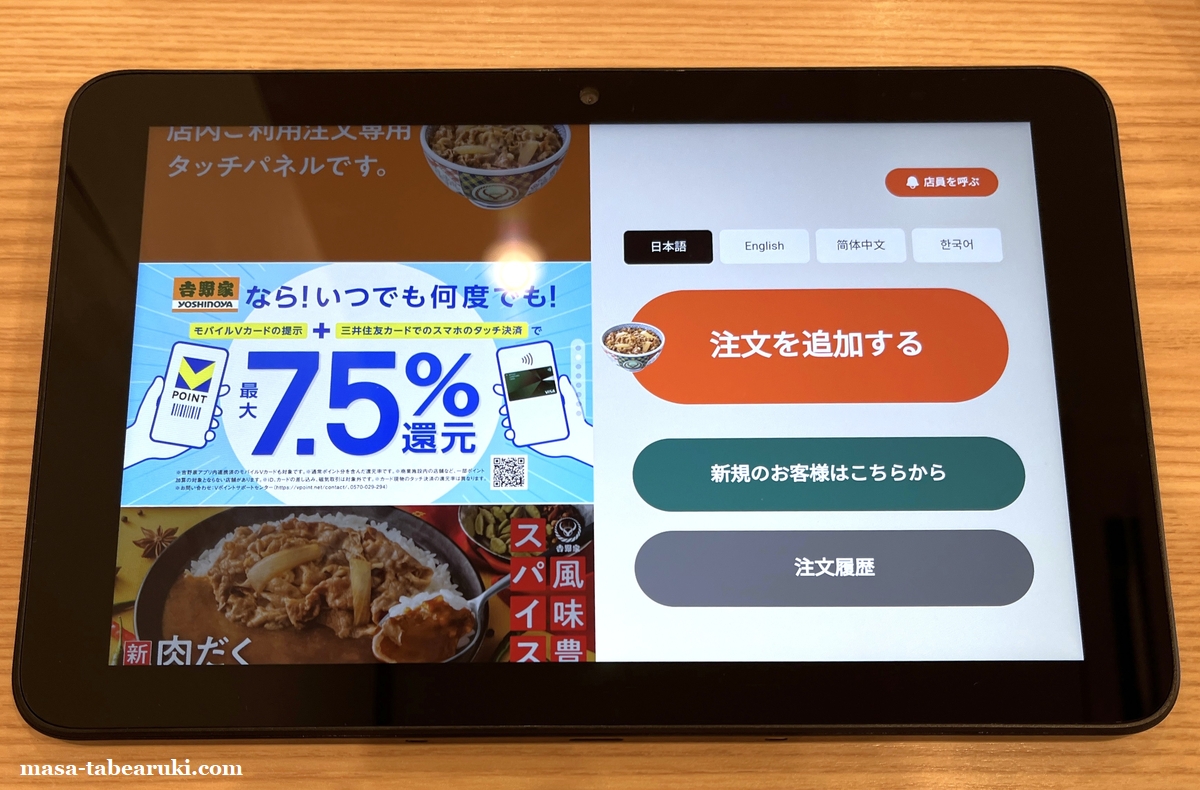 この日の昼飯は吉野家でこの時期に発売されるメニューがあったのでお店に向かうことにしました。その前に席に着いて気づいたのですが、注文はタブレットで行う形が導入されていました。個人的にはこちらの方がラクで良いのですが、クーポン等が簡単に使用できるようになるなら支払いもセルフだと良いですね。