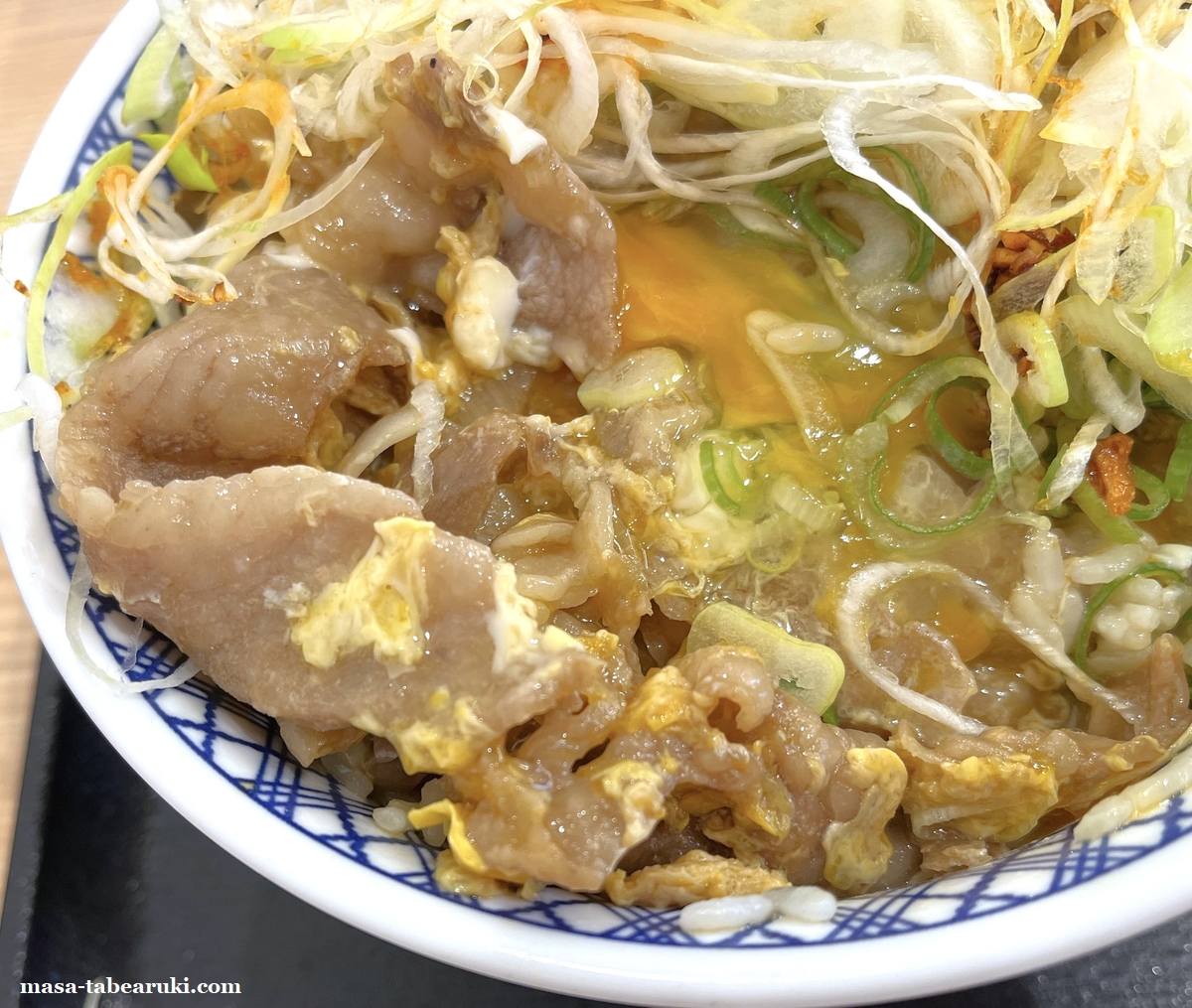 玉子でとじられた状態は良かったのですが、肉が以前に食べた時となんか違う。食感もあまり良くなくメニューや公式を確認すると”牛とじ丼は成形肉を使用しています”と書かれていますが、個人的に好みではありませんでした。