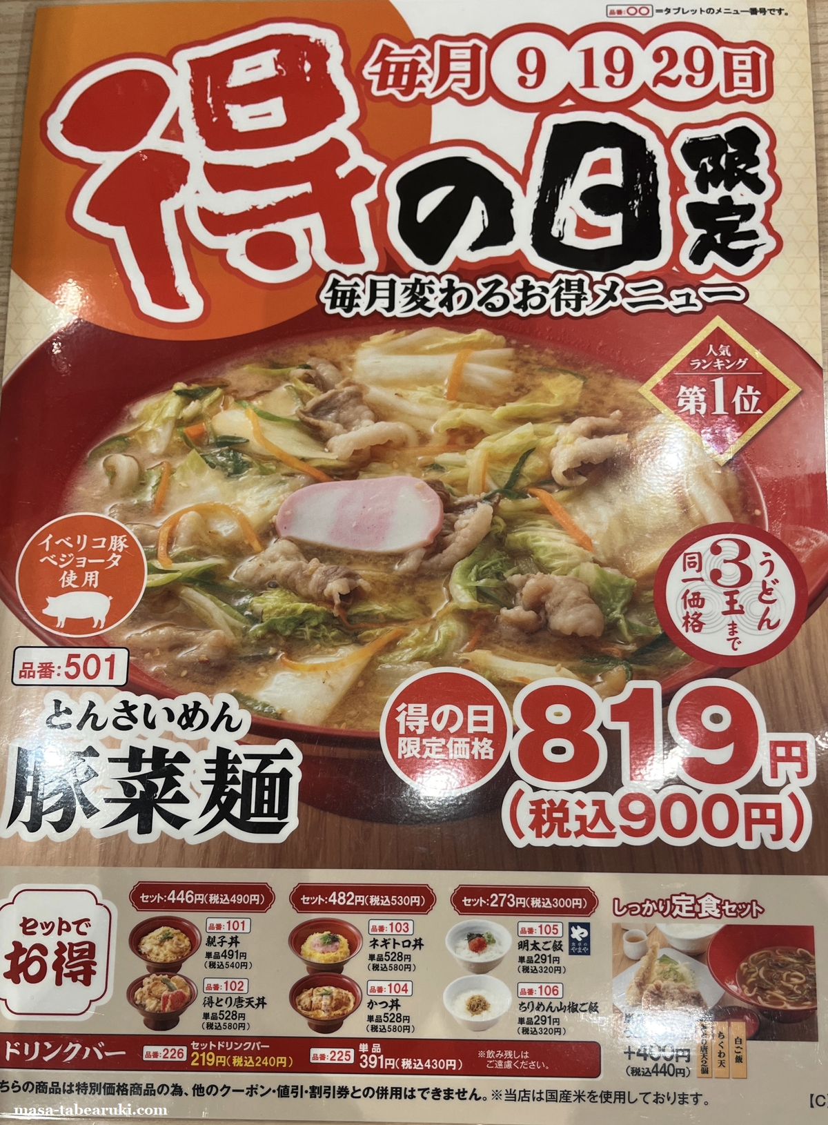 今回は得の日において久しぶりに「豚菜麺」を食べてみましたが、なかなかボリューム感もあって単品でもお腹はかなり満足することが出来ました。ただこのうどんは個人的にやっぱり寒い時期に食べるほうが好みかな。