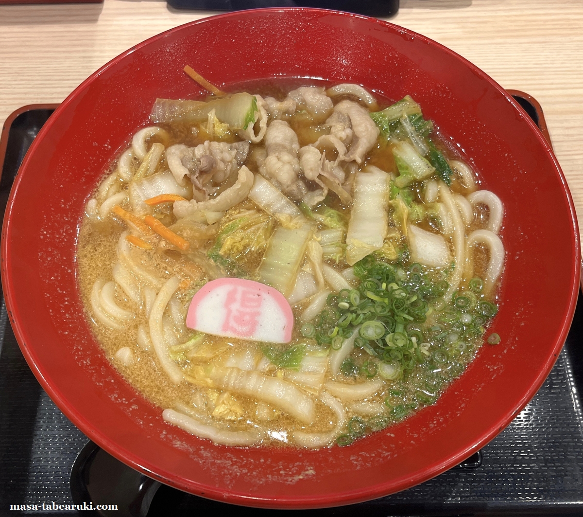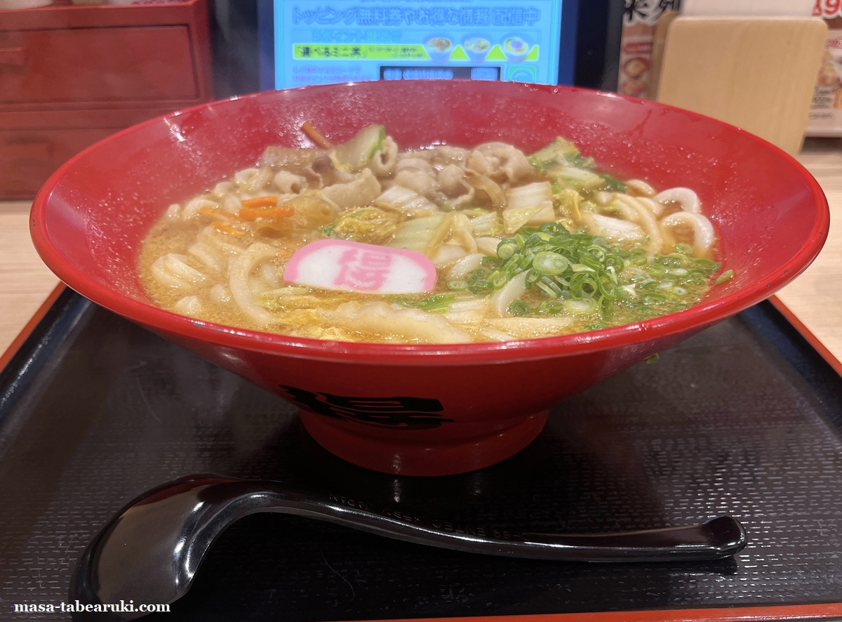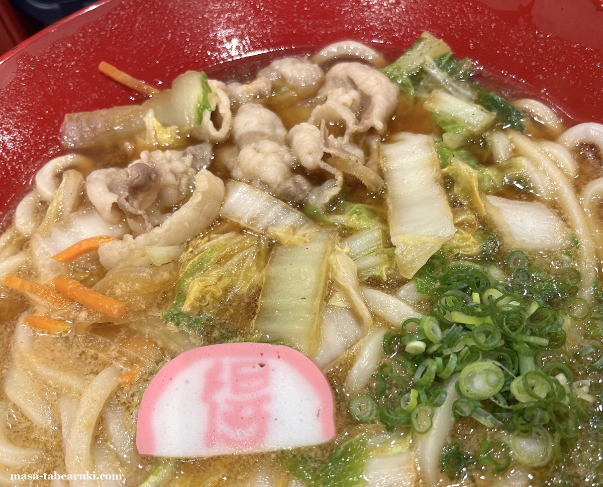 具材は豚肉、白菜、人参、ネギ、カマボコなどが載っており、出汁は味噌を使用したものでうどんはちょっと柔らかめ。実は得得のメニューの中で人気ランキング1位の商品でもあります。