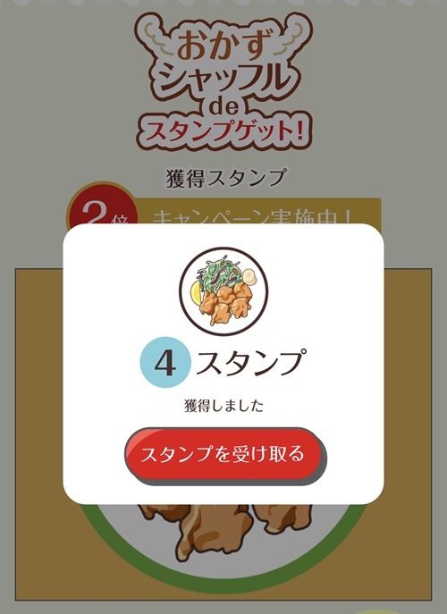 それからもうほぼ終了となりますがこんなサービスを今月されていたんですね。。9月末までミニゲームのスタンプが2倍になるとのことで、この日はおかずシャフル(画像が揃ったらOK)をやってみたら珍しく揃ってしまい、倍の4ポイントをゲットしてしまいました(笑)おかげ様で15マスまで到達しましたが、あと半年でどのくらいまで貯まるかな?