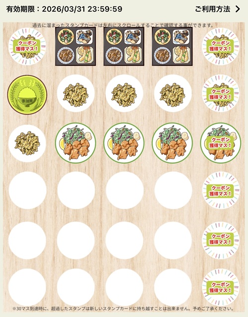 またスタンプカードには期限があり(私の場合は3月末ですが皆そうなのかは不明)、この期限を過ぎると貯めたスタンプはリセットされまた最初からとなりますのでご注意下さい。