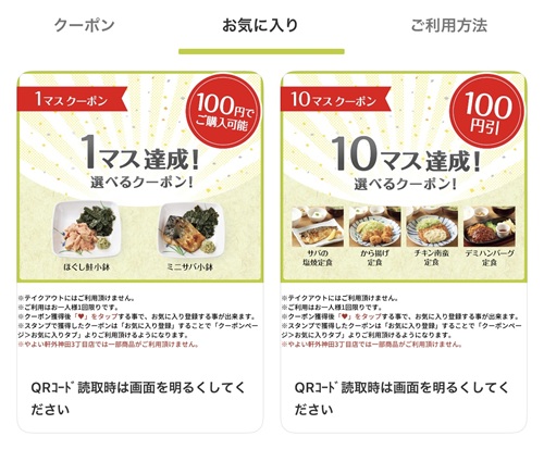 | 10マス | 100円引き(サバの塩焼き定食、から揚げ定食、チキン南蛮定食、デミハンバーグ定食) |