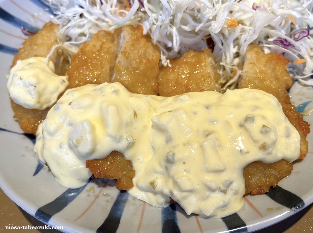 鶏肉は非常に柔らかな食感でコロモは酸味のある少しネットリした食感があるものに、タルタルソースがタップリとかけられた状態。この微妙に旨い酸味とタルタルソースはご飯がかなりススム味わいかと。