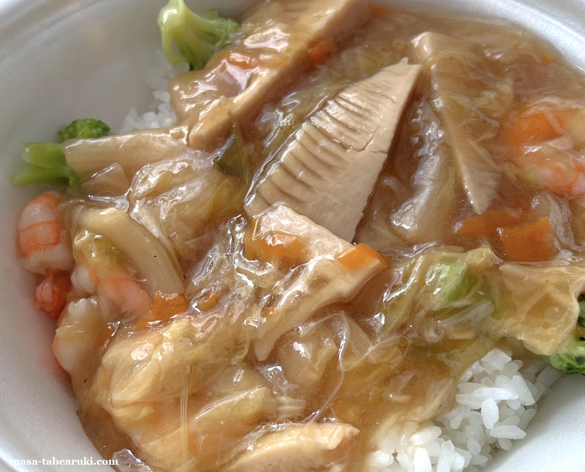 餡の粘りは強く醤油やオイスターソース、ごま油を使用されているとのことで、中華丼としては王道的な味わいに思えます。またドロッとした餡に対してブロッコリーや筍の食感がアクセントになっていました。