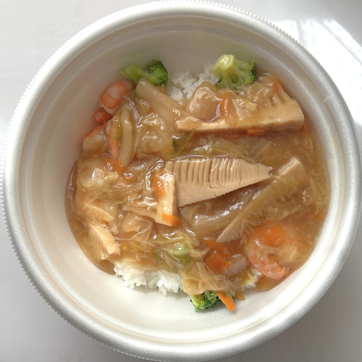 並盛にしたのでちょっと少ない感じに見えますが、朝飯も兼ねているので問題なし。具材はエビ、筍、ブロッコリー、白菜、人参となっており、中華丼としてはほとんどが定番っぽいもので構成されています。ただブロッコリーは個人的にあまり見かけず、緑色は絹さや等のイメージがあるかな?