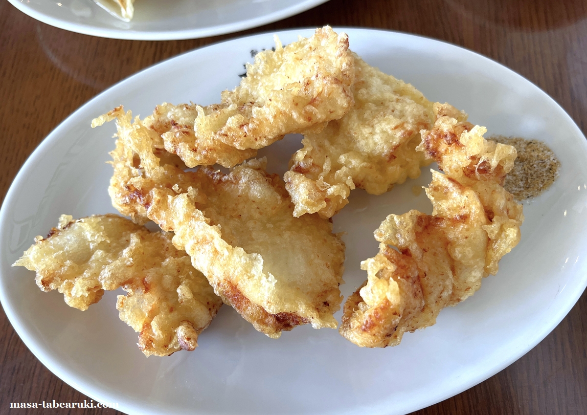 とり天か餃子が到着した時点でご飯のおかわりをして頂きますが、以前ならもう1回くらいはしたおかわりも現在は1回にしております(個人的な事情)。とり天はいつも通りにサクサクと非常に軽い食感のコロモが良く、下味も付いているためそのまま食べても旨い。魚粉の混じった胡椒も付属しているのでこれで食べても旨く、個人的にはかなり気に入っている一品のひとつです。