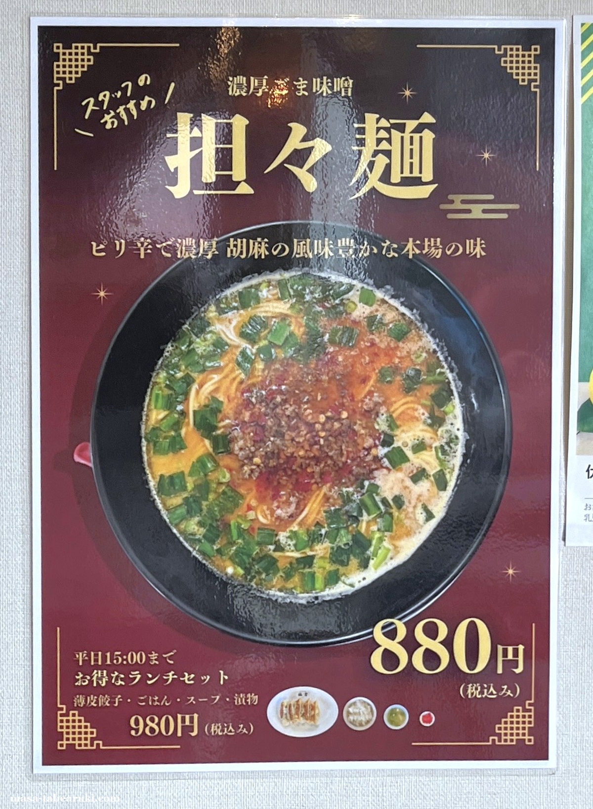このようにランチの時間帯に来るとランチメニューの魅力には勝てずついつい注文してしまいますが、ちょっと気になるメニューが壁に貼られているのに気付きました。それがこの「担々麺」なんですが、単品だけだったらそれほど気にならなかったかもしれません。