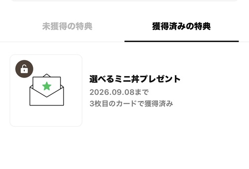 クーポンはLINEの方で貯めているポイントで5ポイント貯めると貰える選べるミニ丼プレゼントの特典です。