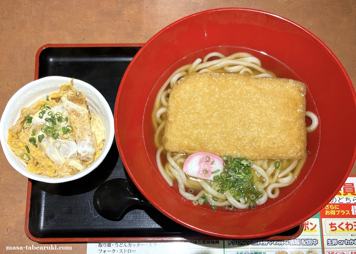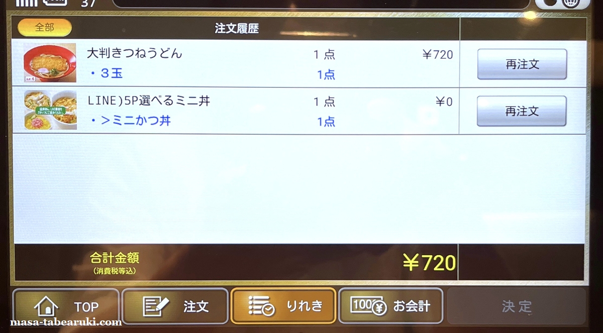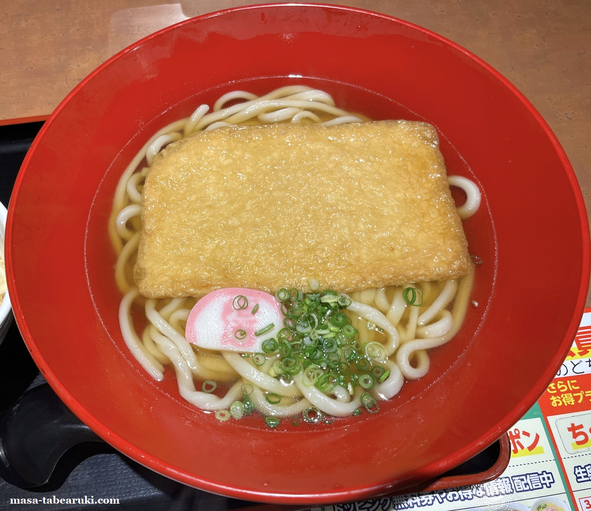 以前はこの特典を利用するにあたり、金額の下限は無かったと記憶しているのですが現在は税込み700円以上の注文が必要なので、いつも頼むのは「大判きつねうどん」。少し前までちょうど700円だったのですが、現在は720円にいつの間にかアップしてました。。