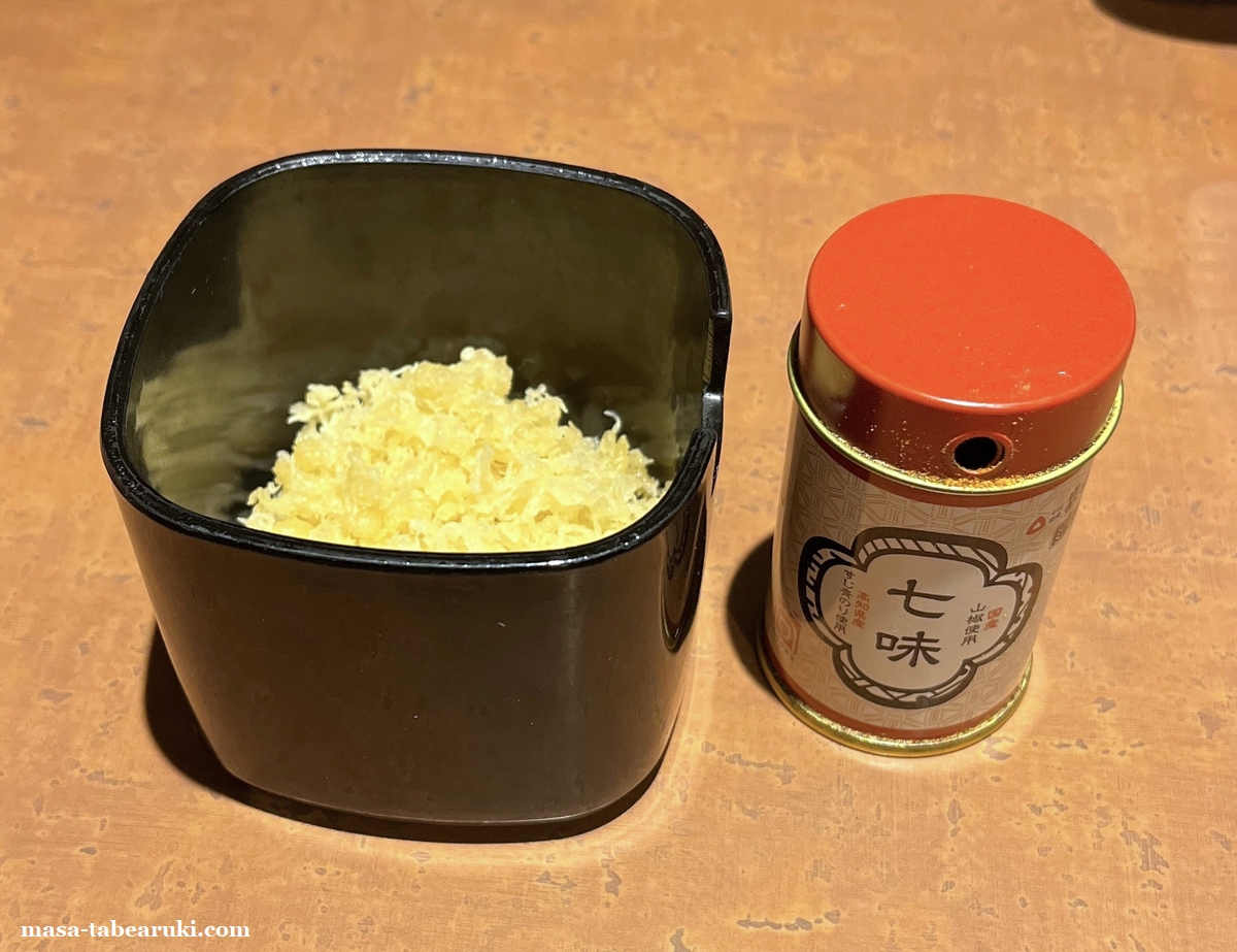 セルフコーナーにある天かすと卓上にある七味です。天かすはいつも利用しており、七味は最近気に入って使用してます。この七味は大阪市にある「向井珍味堂」という会社が得得用のオリジナルブレンドとして調合されているようで、辛味はそれほどではないものの風味が良く出汁にもいい変化を付加してくれているように感じます。