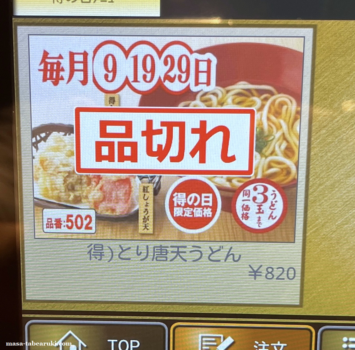 最後にうどんの到着を待っている時に何げなく注文端末を見ていて「得の日」のボタンを押すとこんな画像が。今月(2025年10月)の得の日はコレなんかな?(未確認)