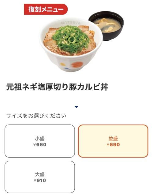 では早速モバイルオーダーしますが、現在松屋のメニューの中で気に入っているのが「スタミナ厚切り豚カルビ」系メニュー。ただ現在は丼が無くなって定食だけとなっており、その代わりという訳ではないのですが(味が全然違うので)、復刻メニューとして「元祖ネギ塩厚切り豚カルビ丼」が販売されています。
