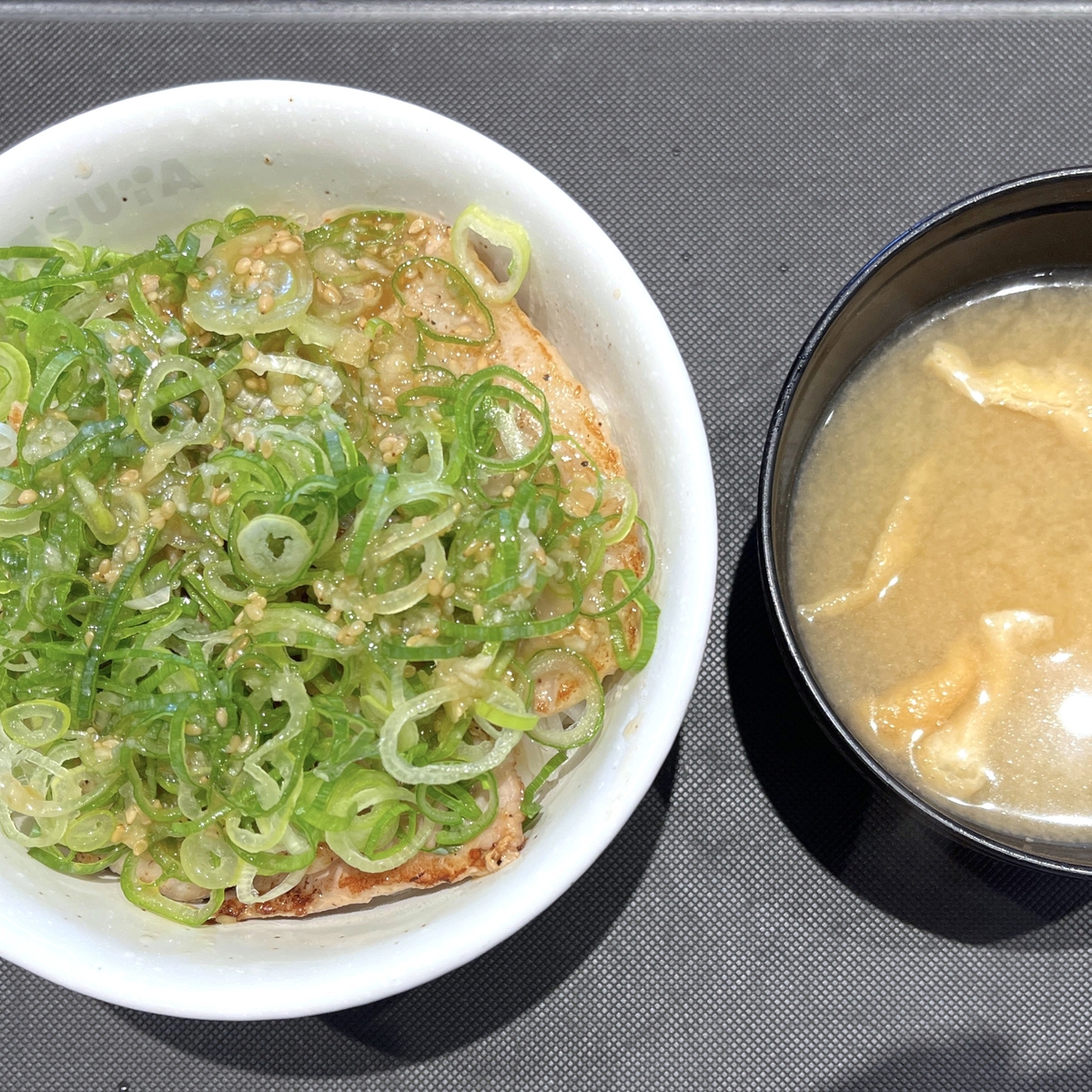 サイズは小盛(税込660円)、並盛(税込690円)、大盛(税込910円)から選択でき、いつもの味噌汁も付属。ネギはタップリと載せられており、肉が見えないくらい。
