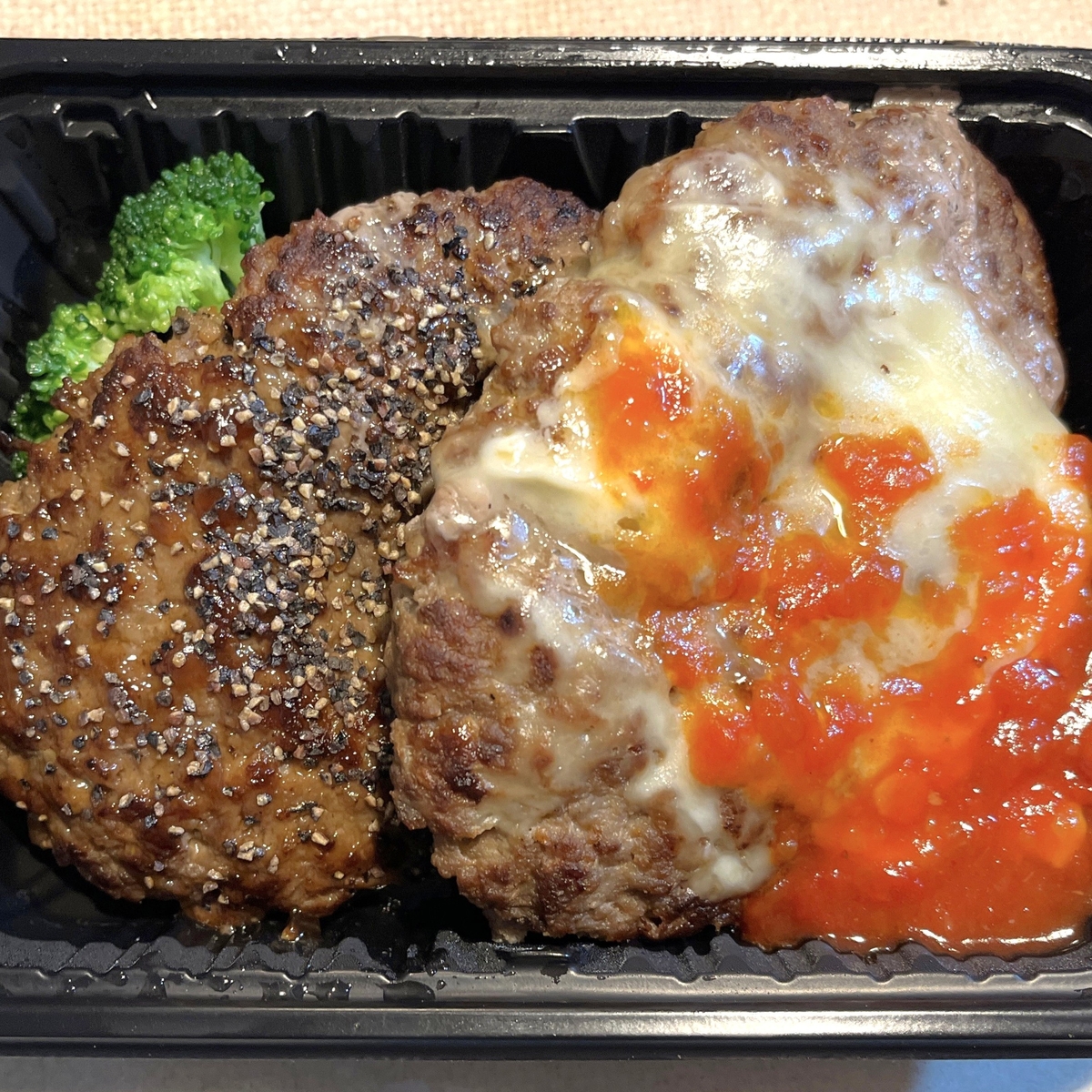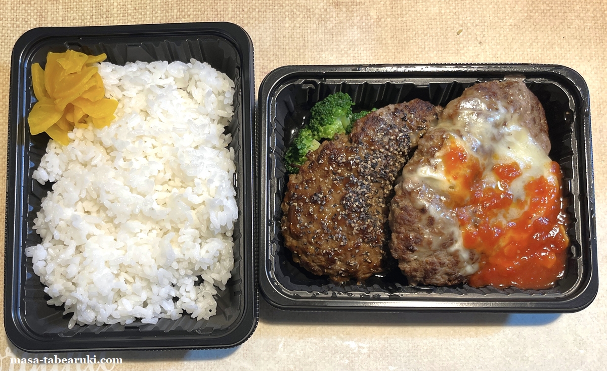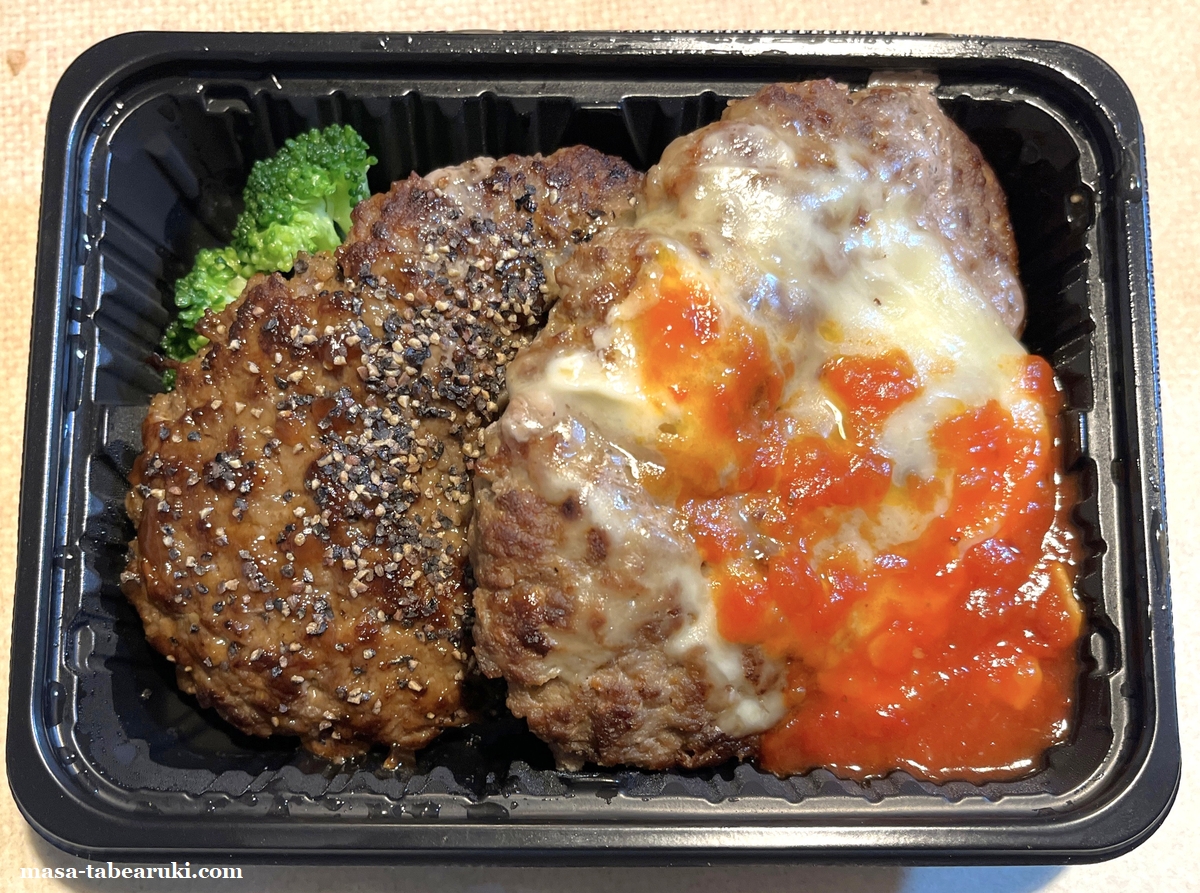 相変わらずのボリューム感(笑)テイクアウト価格は以前は千円以内に収まっていたのですが、現在は税込1,014円と少し超えてしまいました。ツインなのでもちろんハンバーグは2種類。ライスは大盛にしても金額は変わりません。ただ以前は付け合わせにブロッコリーの他にポテトやコーンもあったのですが、今回はブロッコリーのみとなっていました。