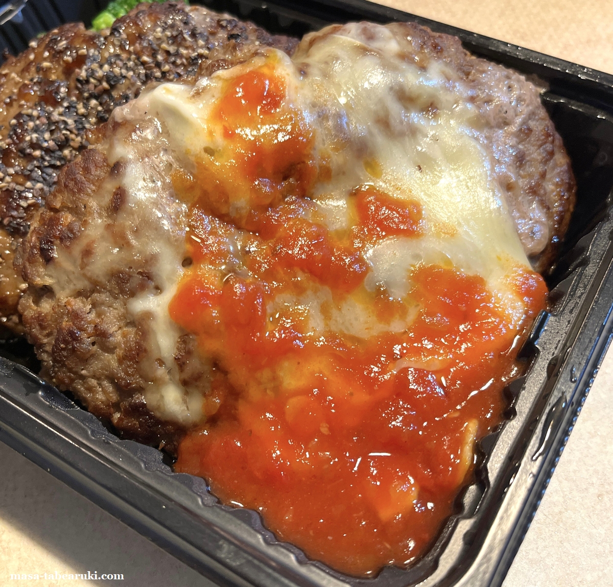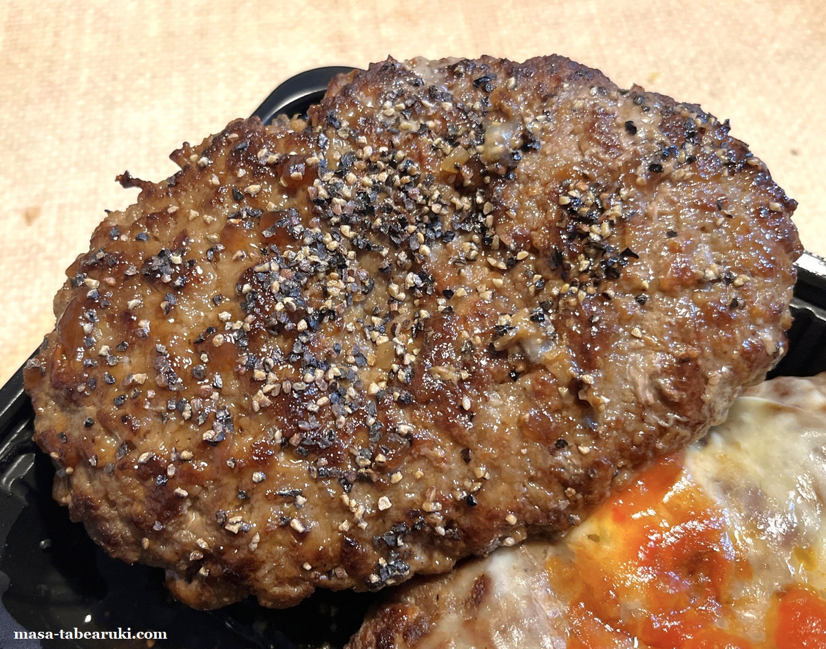 ハンバーグは前述した通りに2種類でチーズハンバーグとペッパーハンバーグ。チーズはテイクアウトでも適度に柔らかい状態でニンニクが入ったトマトソースとの相性も想像通りに良い。ブラックペッパーのほうはいつもソースは少なめに感じるものの、ブラックペッパーだけでも風味も良く旨い。ハンバーグ自体はどちらも同じながら、お店で食べるよりも劣るだろうとは思いつつも、肉汁もあって牛肉の風味がしっかりと感じられます。