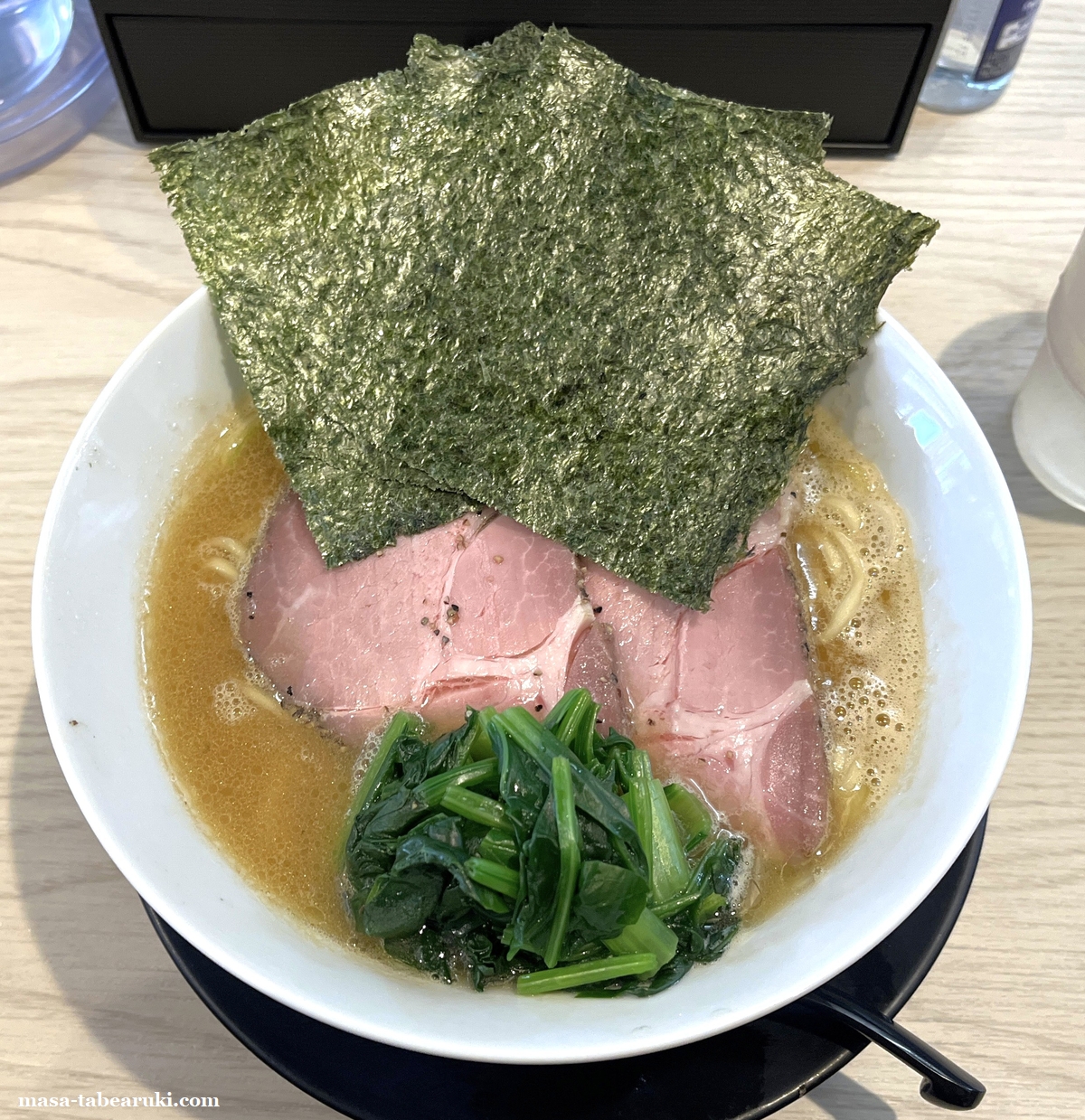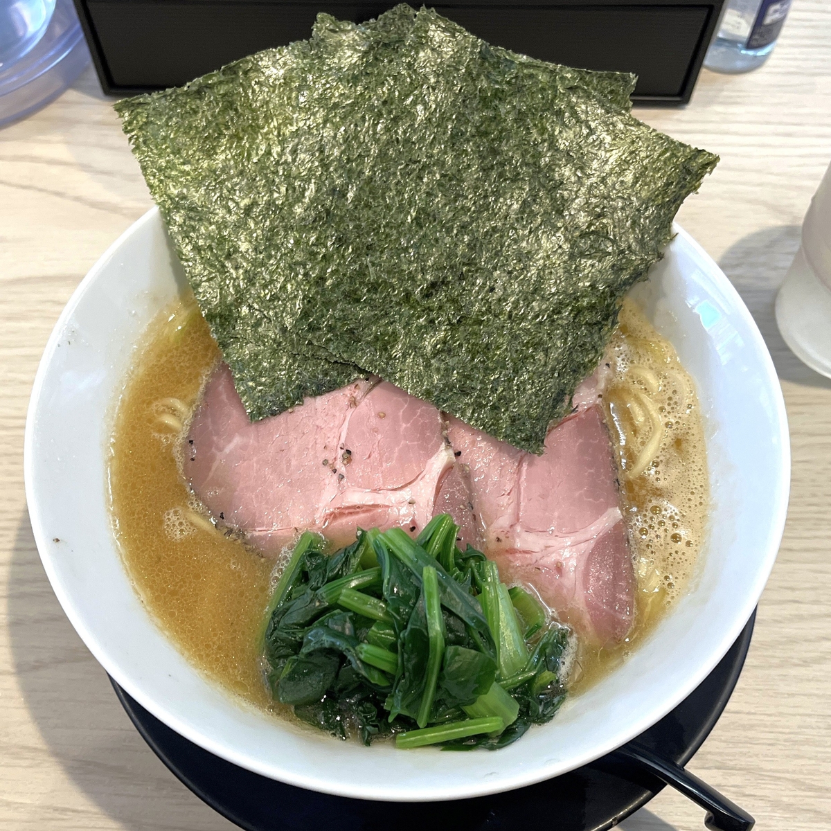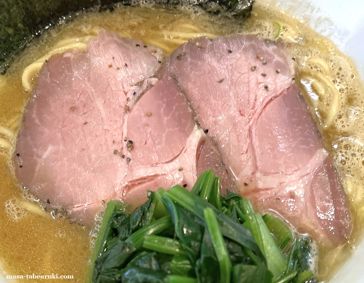 具材はチャーシュー、少量のネギ、ほうれん草、そして海苔。ブラックペッパーっぽいのも少し見えますが、チャーシューにくっついていたものかもしれません。