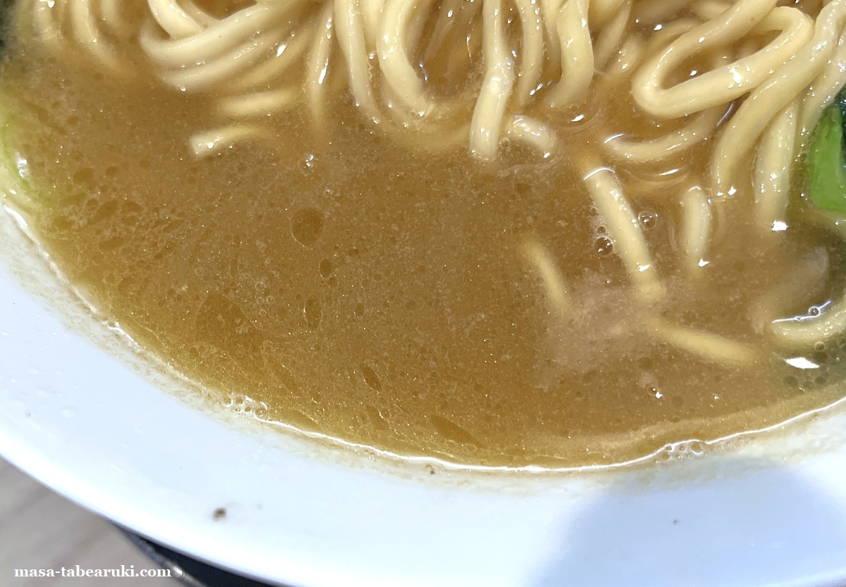 麺は太めで平たい形状をしており、口当たりは滑らか。麺の長さは短くは無く大盛の量もしっかりとあり、この一杯でも満足感を得ることが出来ます。スープは臭みなどは全く無く、豚骨と鶏を使用されているようで濃厚さはあるもののクドさは感じず。タレはやや強めに効いている印象で、チェーンの家系ラーメンよりも濃厚に感じました。