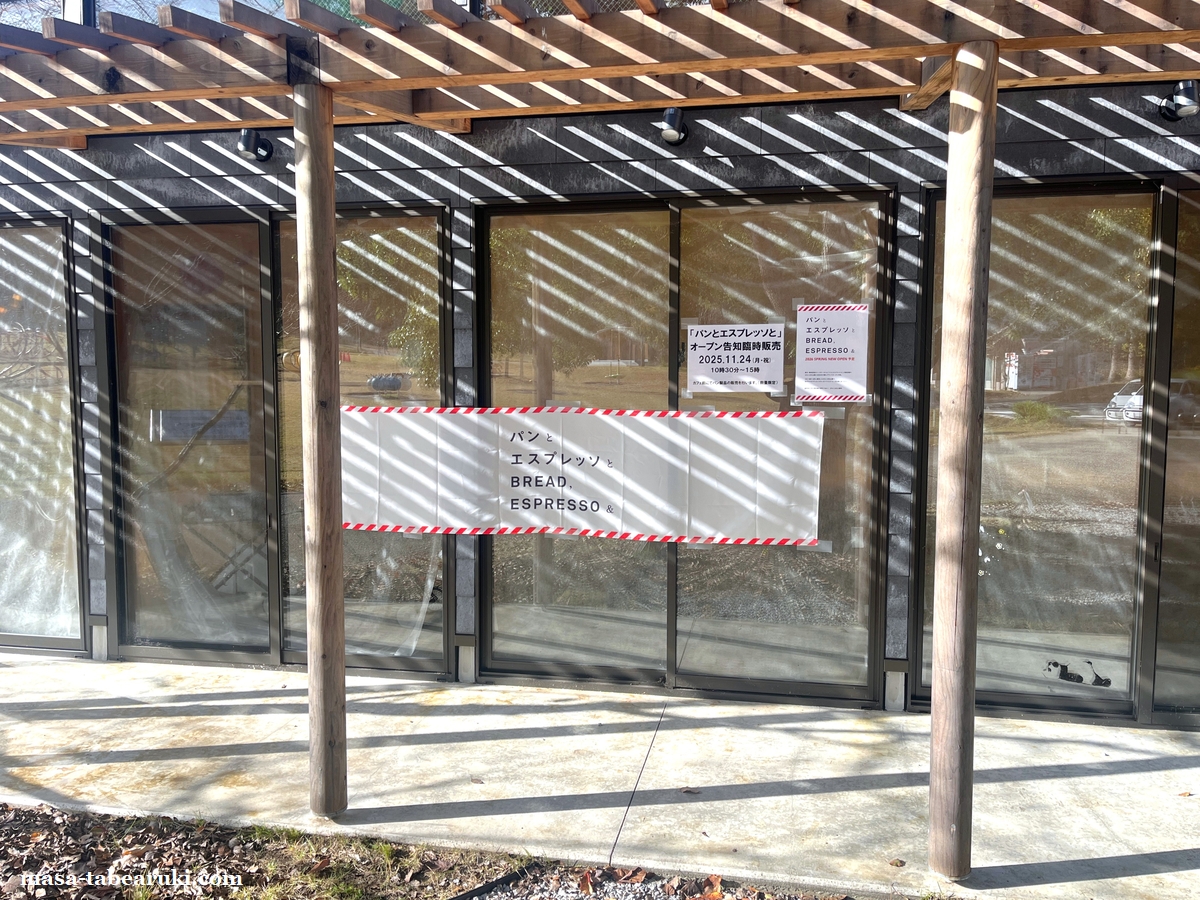 また、公園内のわんぱく原っぱ前に1年前に休業したカフェの建物があるのですが、この日前を通ると「パンとエスプレッソと」というお店が2026年春にオープン予定という貼り紙がありました。この記事公開時点では終了していますが、11月24日にはオープン告知臨時販売が10時30分から15時の間でされていたみたい(私は朝から所用で行けませんでした)です。どんなお店がオープンするのか気になるところです。