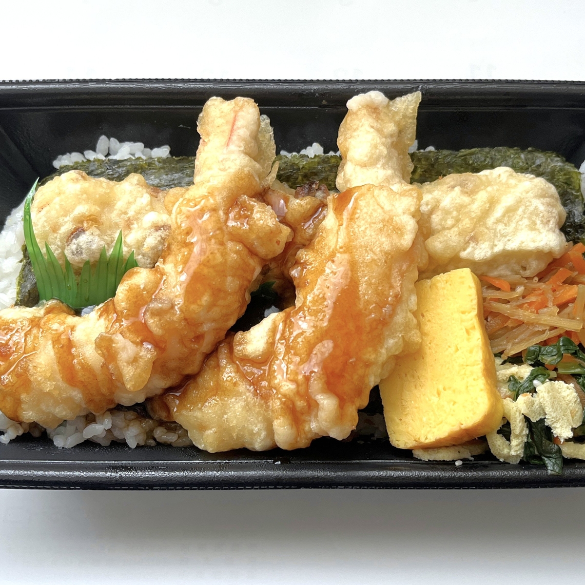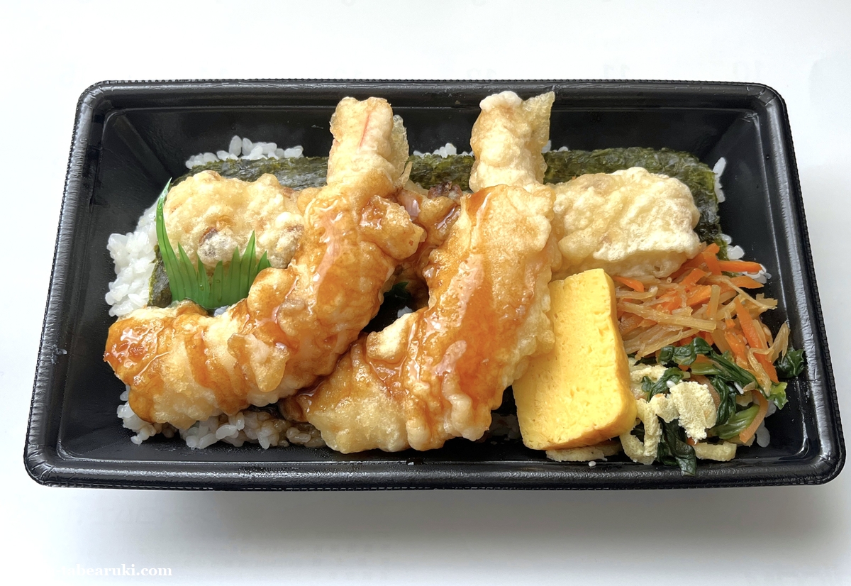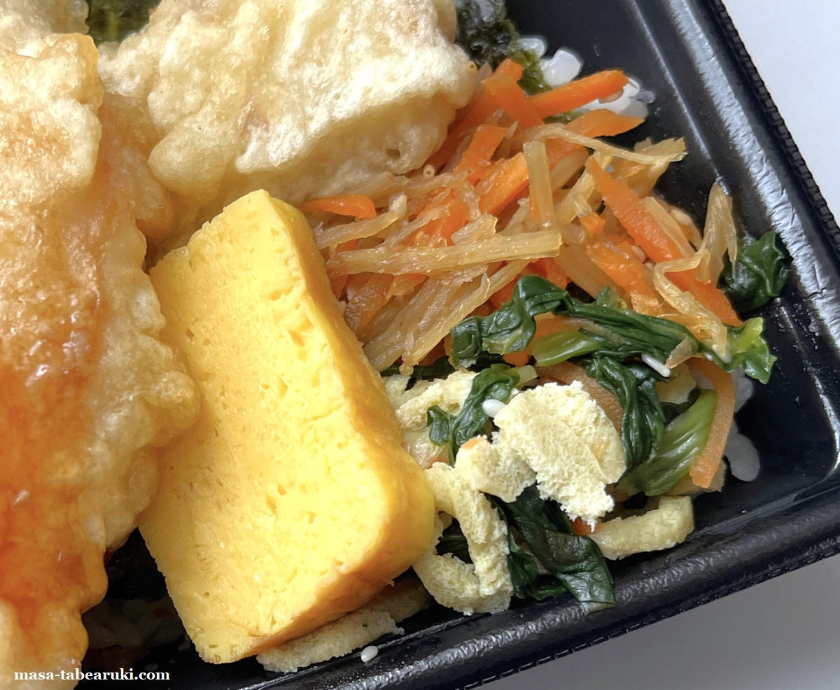 副菜として載っているキンピラはのり弁と同じながら、小松菜と油揚げの和え物、だし巻き玉子も載っているところもちょっと豪華に感じる部分かもしれません。海苔の下にはおかか昆布もあり、海老天のちょっと甘辛いたれで食べるのも悪くないかと。