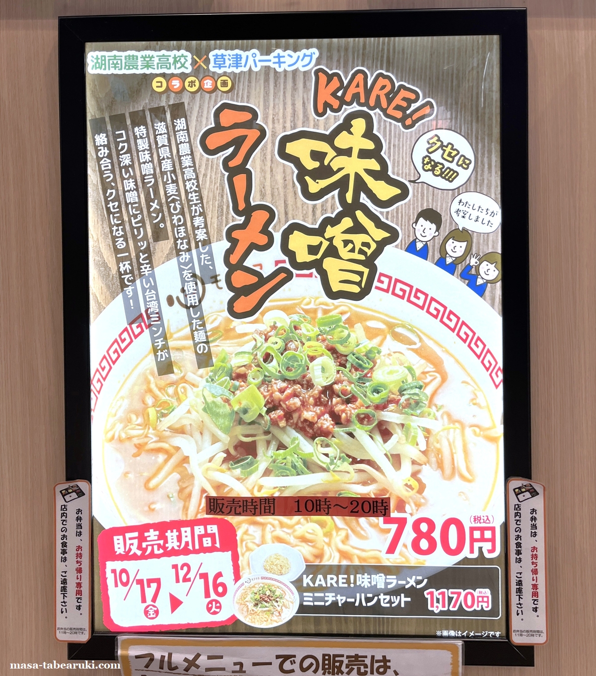 POPを読むと草津市にある湖南農業高校と草津パーキングのコラボ企画とあり、湖南農業高校の生徒が考案したラーメンを提供されている模様。期間は2025年10月17日から12月16日までの2か月間で1か月以上経ってから私は気付きました(笑)