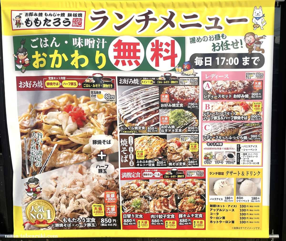 ご飯と味噌汁はおかわり無料。お好み焼き ももたろうの『ももたろう定食』