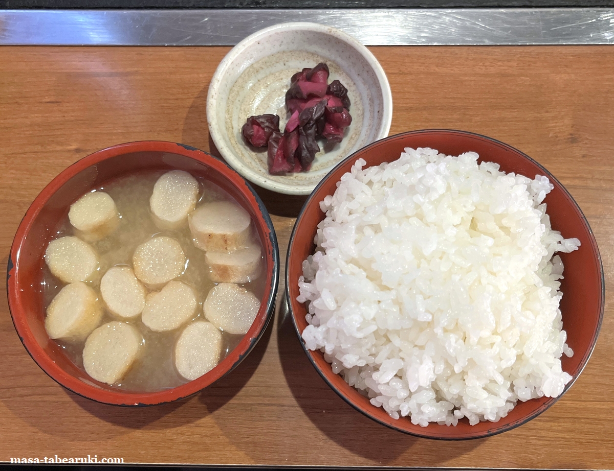 そしてこちらのランチの特長であるご飯、味噌汁のおかわり無料の部分。保温ジャーや味噌汁マシンなどが1か所に置かれており、セルフでご飯や味噌汁は盛り付けます。味噌汁はボタンを押すと味噌汁のみが出てくるタイプで、具材としてお麩が置かれているので適量を椀に入れてからボタンを押す形になります。