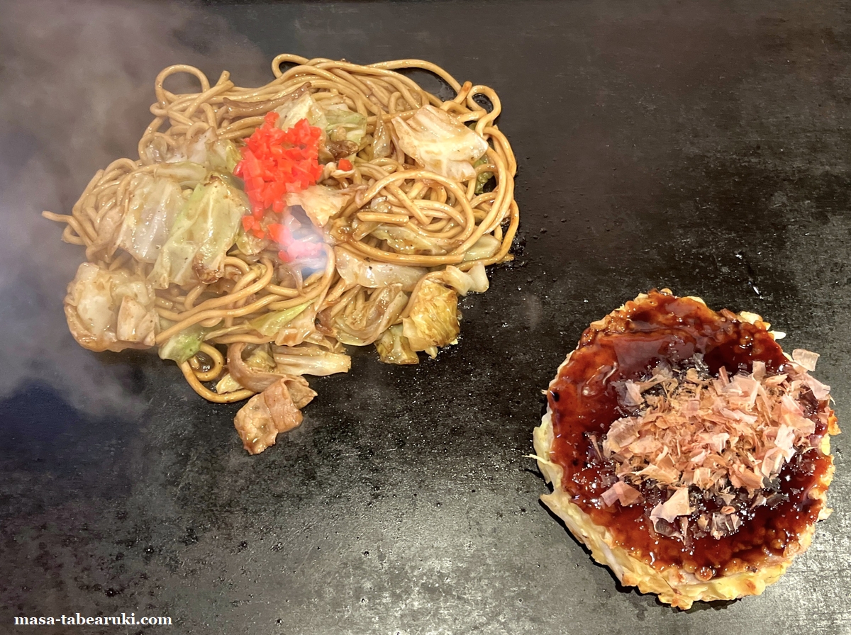 ももたろう定食は豚焼そばと豚玉ハーフ、それにご飯と味噌汁、漬物がセットになっています。豚焼そばはやや甘味のあるソースがかけられており、素朴な味わいながら懐かしい感じで太めの麺が好印象。量的には並盛かと思われ、大盛に変更する場合は+200円(税別)で増量することも可能。