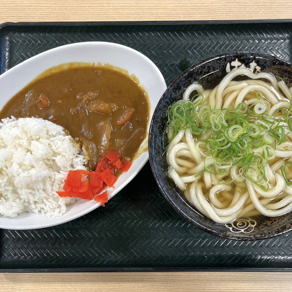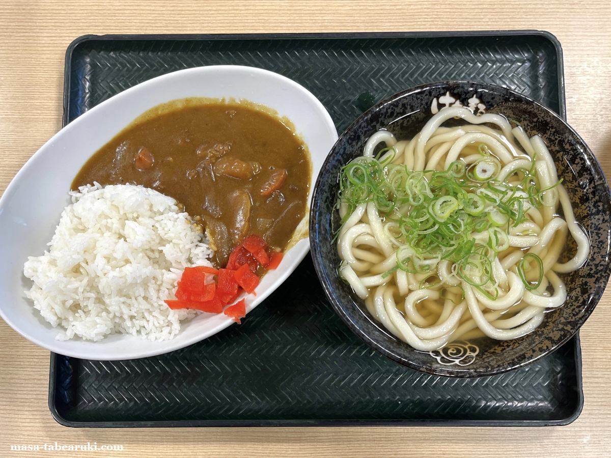 では帰り道で昼飯を取ることにしますが、久しぶりにこちらのお店へ。厨房の上部にあるメニューを見ていると「カレーセット」なるものを発見。最近は得得でもカレーうどん系を食べたりしてうどん屋さんのカレーもいいなと思っていたため、今回はこれにすることに。