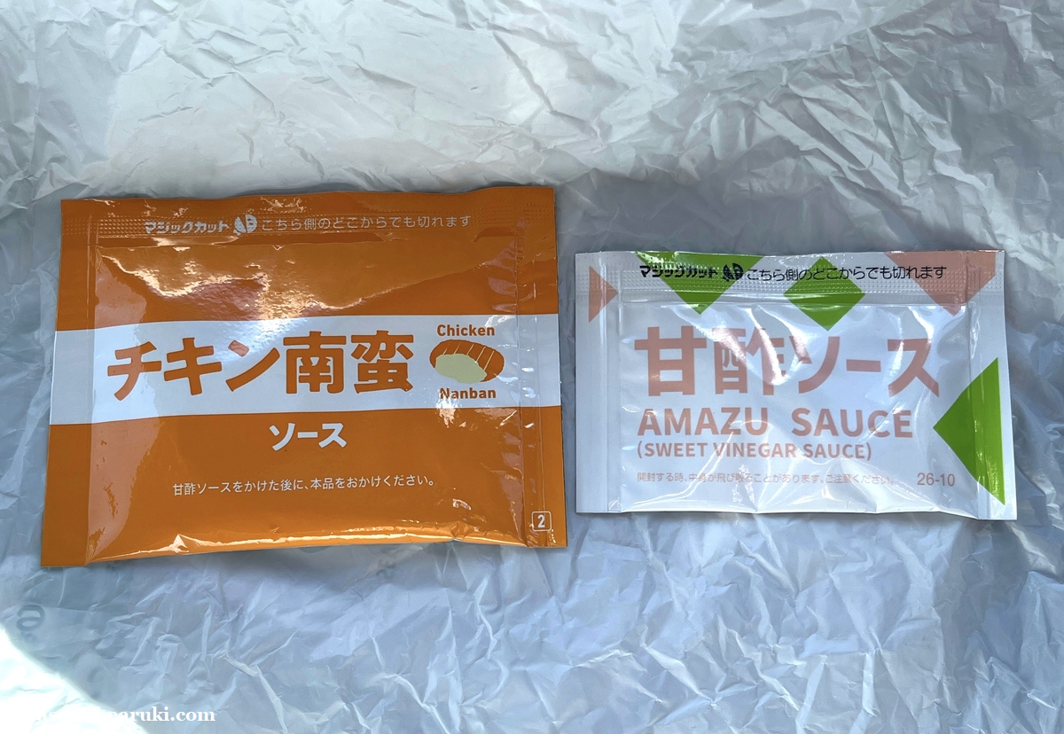 九州版に付属している小袋は二つで甘酢ソースとチキン南蛮ソースとなっており、甘酢ソースは通常のほうでも付属しているものの、もうひとつはタルタルソースとなっているようです。