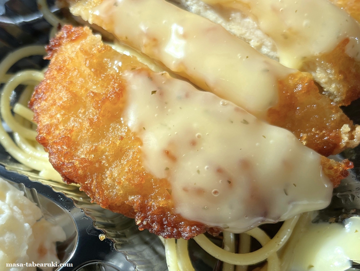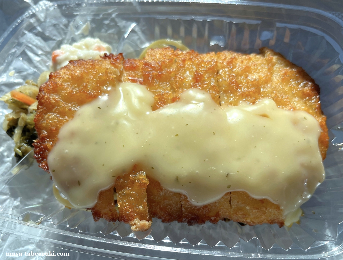 大昔に私が違う弁当屋さんでバイトをしていた時のチキン南蛮は、コロモは既に甘酢がしみ込んだ状態のものを湯煎で温めて提供し、タルタルソースをかけて食べるというスタイルでした。そのためカリッとした食感は端っこ部分くらいでしたが、これは直前に甘酢ソースをかけるためサクサクした食感が楽しめますね。