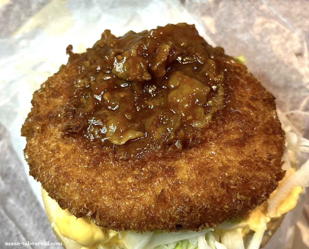 バンズは昨年もそうでしたが、ふわふわの柔らかい食感でそのすぐ下にはビーフデミフィリング。そしてグラタンコロッケ、さらに下にはキャベツと特製ソースといった構成。