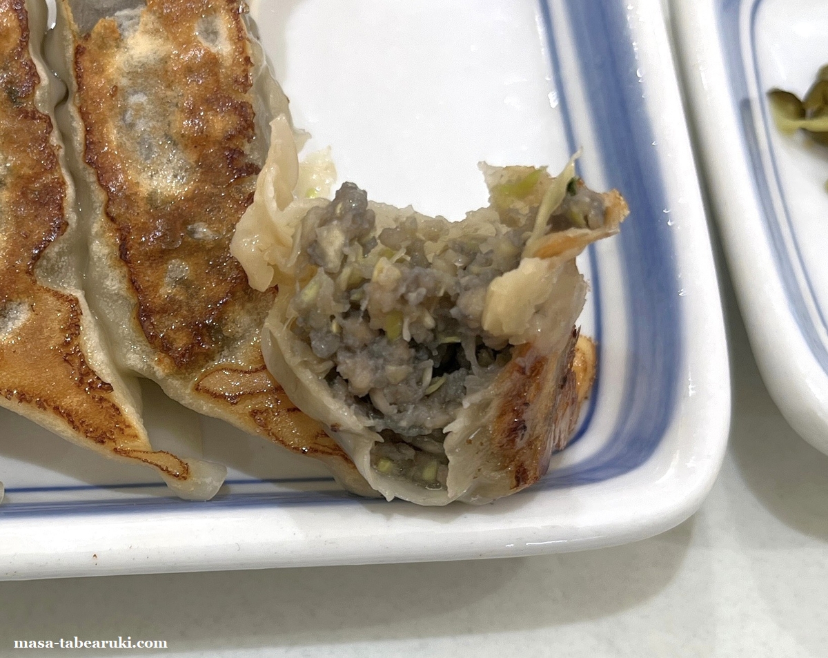餃子は注文時ににんにくの有無を聞かれたので今回はアリでお願いしていますが、軽く効いている感じで強くはありません。サイズは餃子の王将よりも小さめで焼き目はパリッとしており他はモチっとした食感。にんにく入りは具材に竹炭を使用されているとのことで、そのため灰色っぽい色合いになってます。