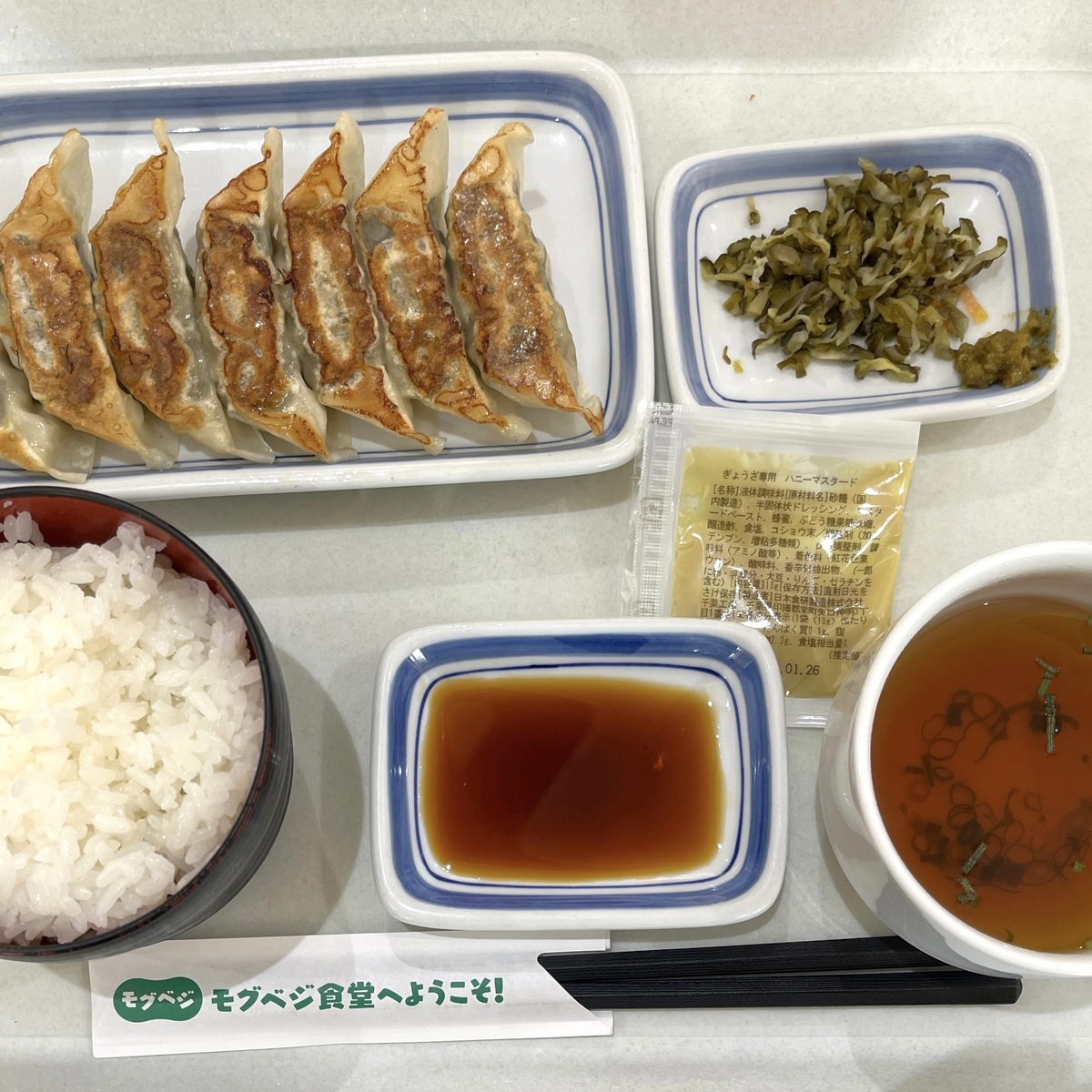 定食はご飯、餃子、スープ、漬物が基本であとは餃子のタレと同じくたれの餃子専用ハニーマスタードも付属。ご飯の大盛は無料でお願いすることが可能です。