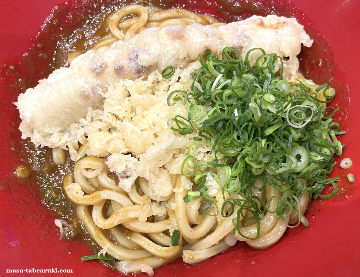 ある程度カレーとうどんを楽しんだ後は、LINEクーポンで貰ったちくわ天とセルフコーナーにある天かすとネギも投入。ちくわ天のおかけで食べ応えもアップし天かすで食感もプラス。