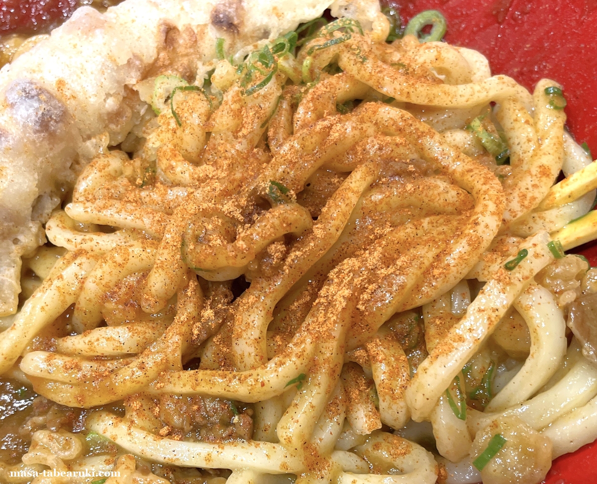 だし割りとは違い、うどんにそのままカレーがぶっかけられている感じのジャワ風。カレーは数種類のスパイスとマンゴーチャツネを使用したルーで、スパイス感にプラスして甘味も感じられ個人的にも最近気に入ってます。