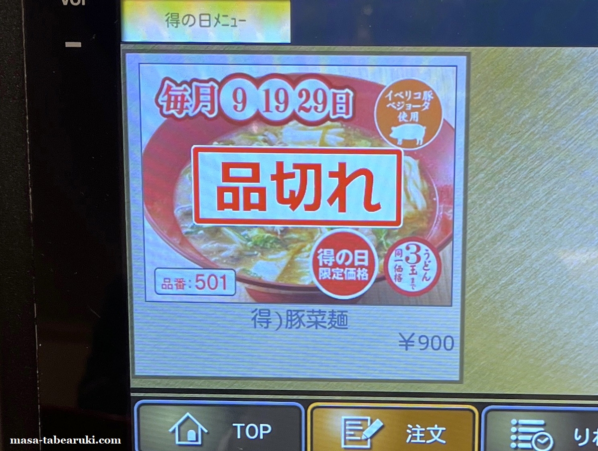 今月の得の日の何やろ?と思ってタブレットの得の日を押してみると「豚菜麺」の画像がありました。この日は注文できませんが得の日は可能で価格も通常の50円引きの900円となっています。