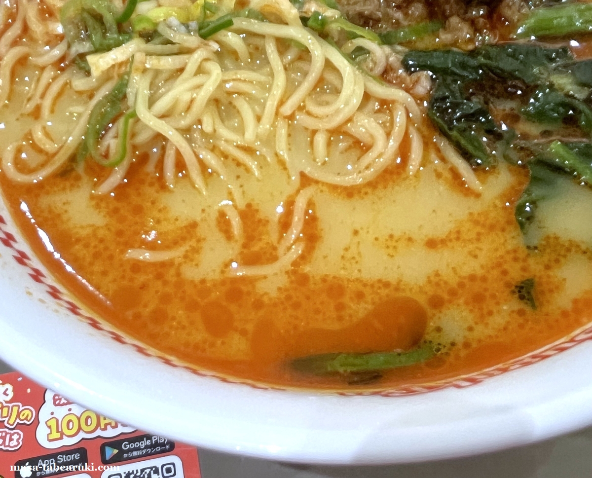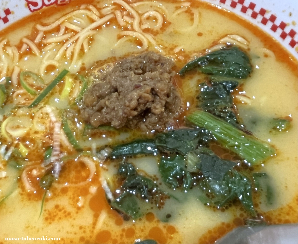 具材は肉みそとほうれん草(以前食べた時は青梗菜だった記憶も)、刻みネギとなっており、メニュー写真ほどでは無いものの赤いものがスープに浮いています。