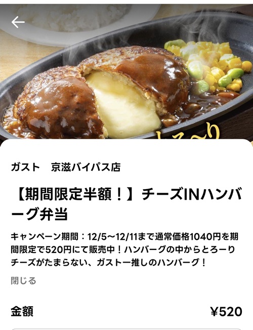 今年は最後?5回目の注文となる、ガストの『チーズINハンバーグ』半額サービス。