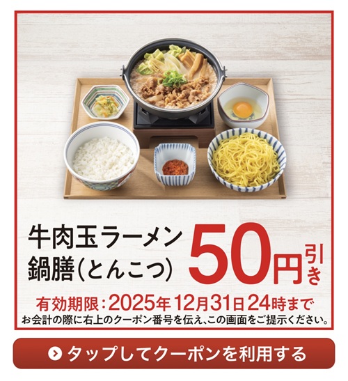 2025年11月27日より販売されている「牛肉玉ラーメン鍋膳(とんこつ)」の50円引きクーポンです。吉野家の麺メニュー第2弾として新登場したメニューで、店内価格は税込み987円で50円引きが入って937円となります。