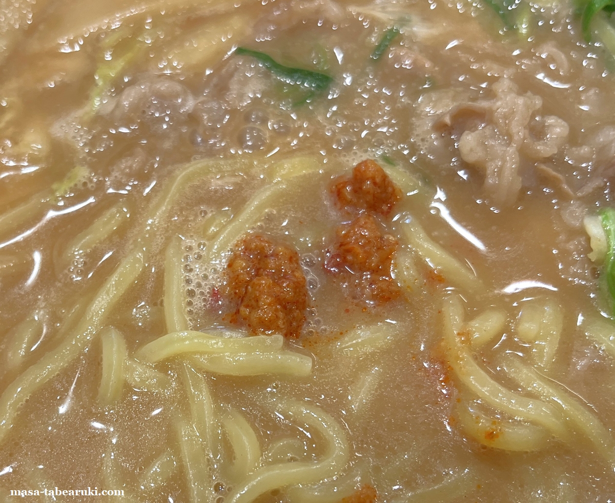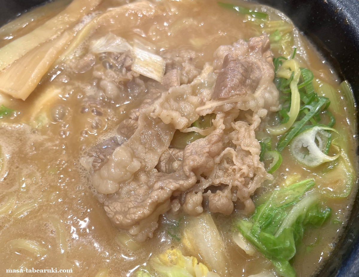 鍋には牛肉、白菜やネギなどの野菜、メンマなどが入っており、肉の量はそれほど多くは無いもののボリュームはそこそこあります。とんこつ醤油のスープはやや濃いめの味わいでこのままでもご飯はガツガツイケますね。