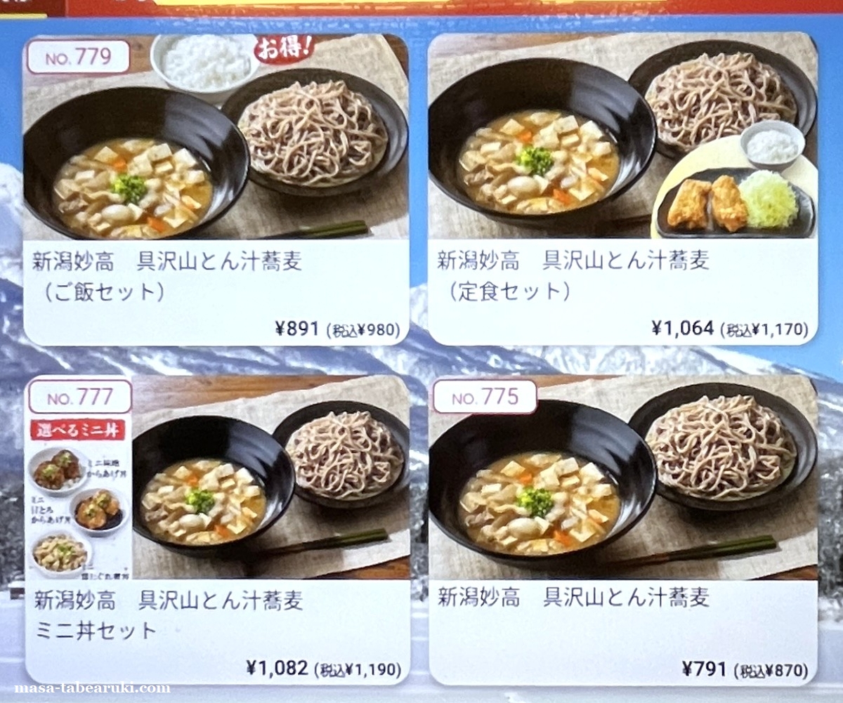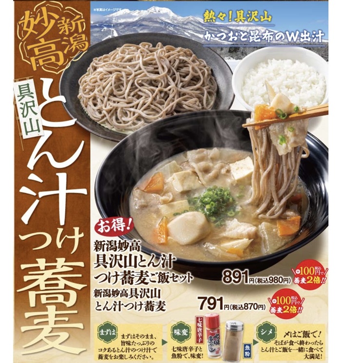 新潟妙高 具沢山とん汁つけ蕎麦と書かれたメニューで揚げ物は全く入っていないものとなります。個人的な今までの経験において豚汁うどんや豚汁ラーメンは食べたことがありますが、豚汁と蕎麦の組み合わせは無かったかも。