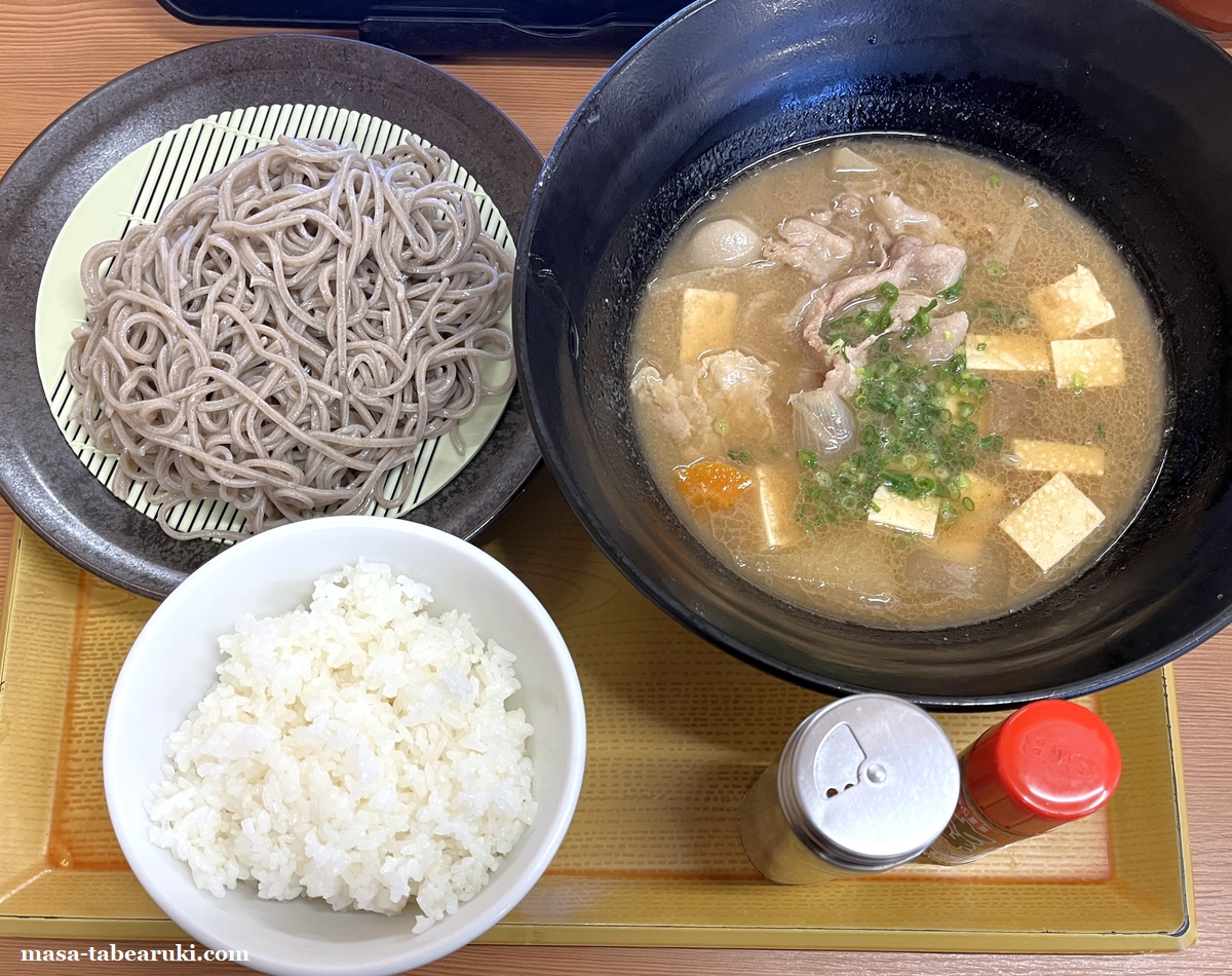 それに惹かれたため今回は注文することにして、から揚げやミニ丼とのセットメニューもありましたが、今回は蕎麦と豚汁にライスだけが付いたものを選択。待つこと数分で到着しました。