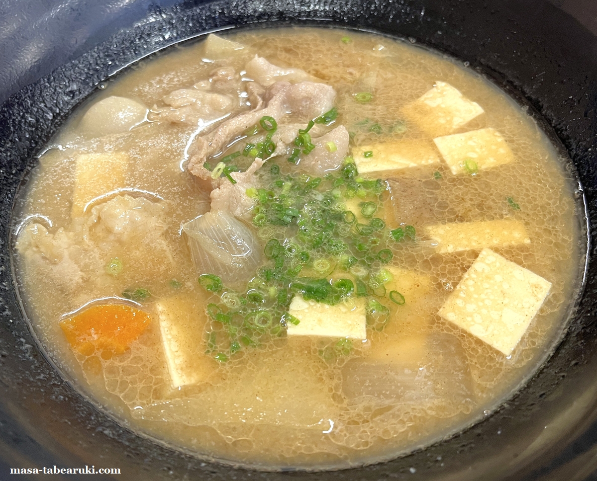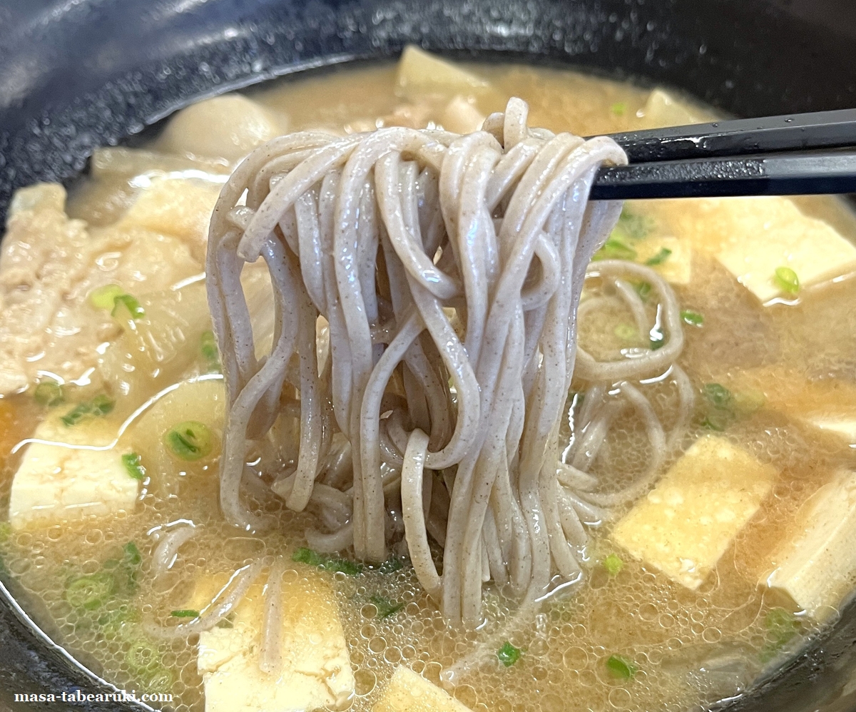 豚汁はやたら大きい丼に盛られていますが、これは蕎麦を浸けやすいようにするためかもしれません。豚汁自体はオーソドックスな感じで、豚肉、木綿豆腐、ネギ、大根、人参、里芋、タマネギと具材も多めで好きなヤツですね。