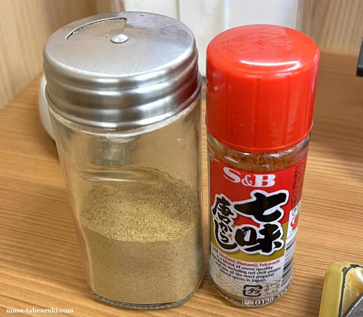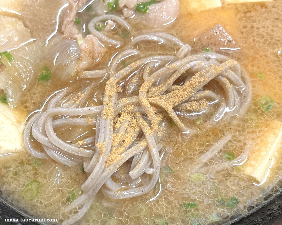 そして味変用に付属してきた魚粉と七味。七味は豚汁には定番ですが魚粉は試したことが無い。これも魚粉の風味が豚汁や蕎麦にも馴染んで良い感じで、特に蕎麦2倍盛にした時に活躍しそうな気も。