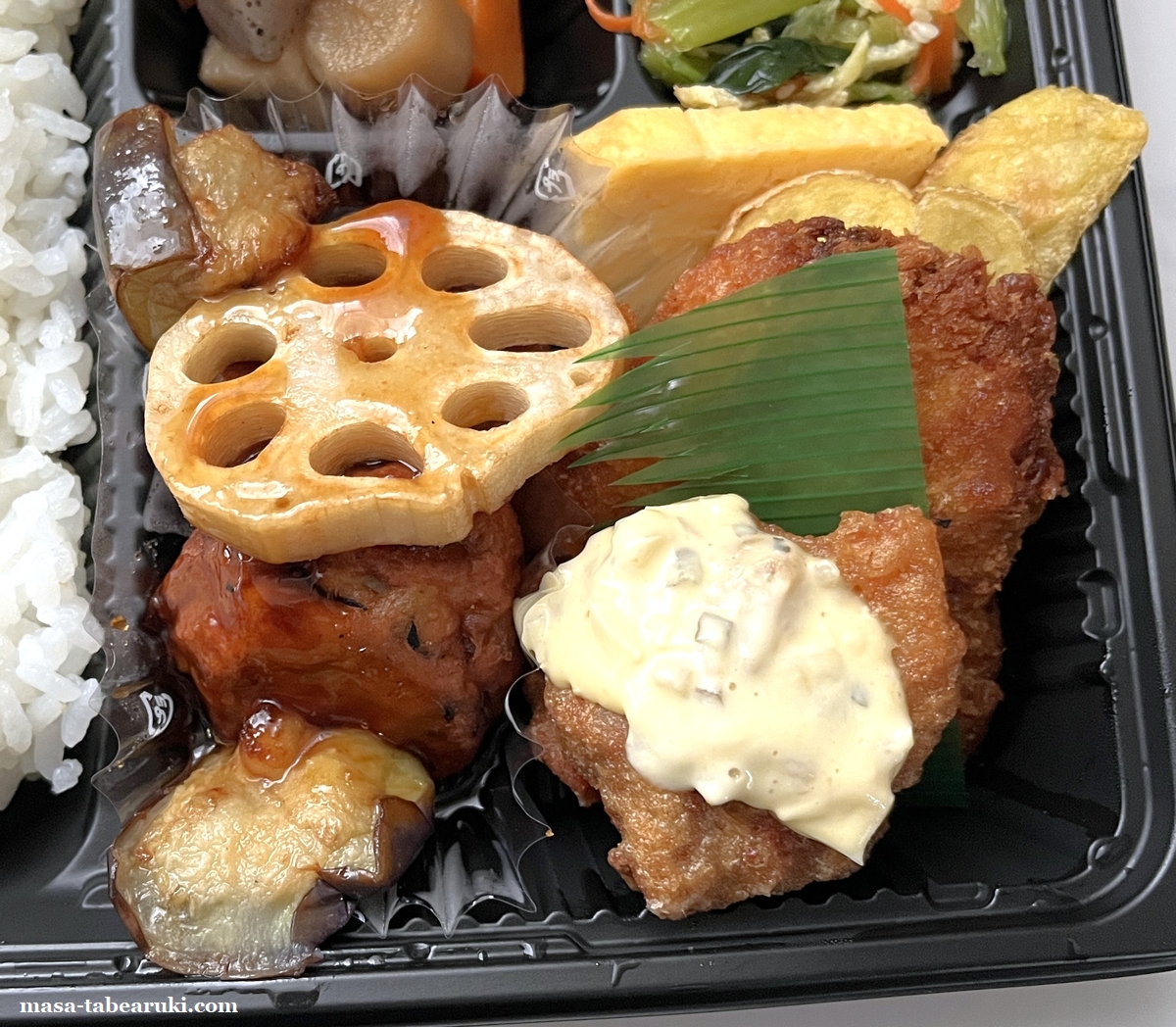 豆腐ハンバーグと野菜には酸味の効いた照りだれが旨く想像通りの味わい。揚げ物系にはから揚げ、白身フライの半身、ポテトフライとなっており、出汁巻きもあります。